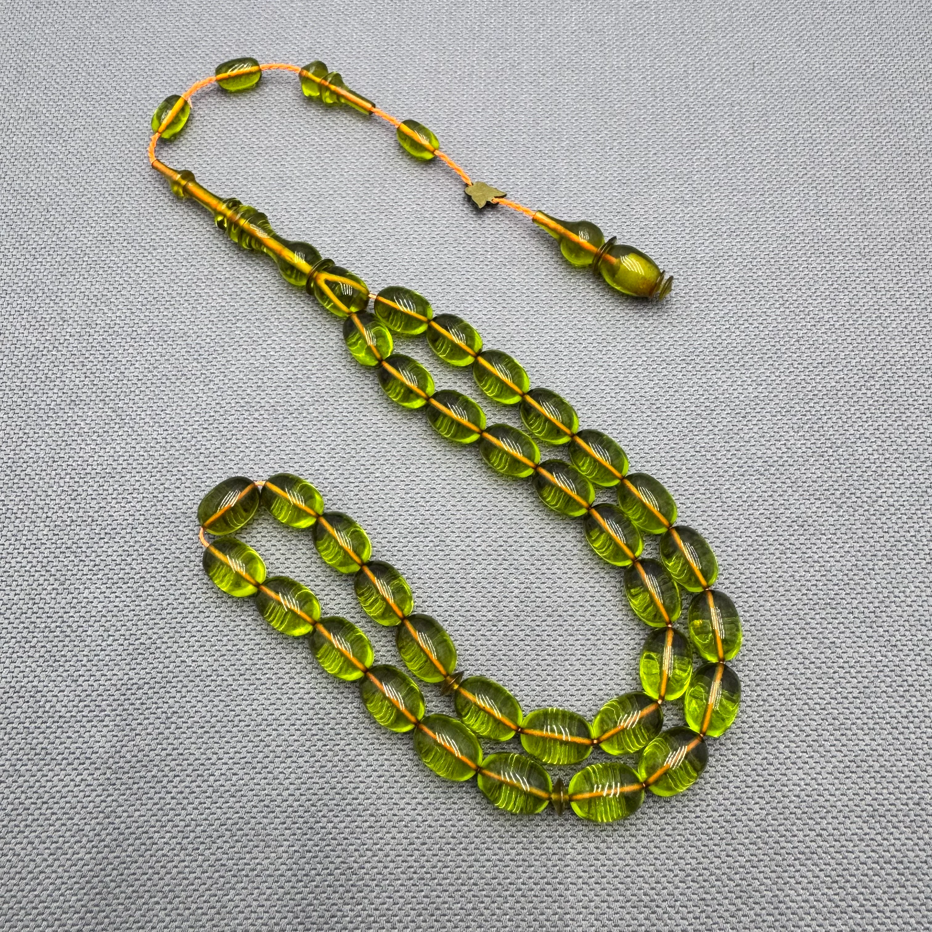 Zamanla renk tonunu derinleştiren ateş kehribar yapısı, tespihin doğal ışıltısını ön plana çıkarır.